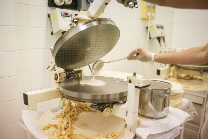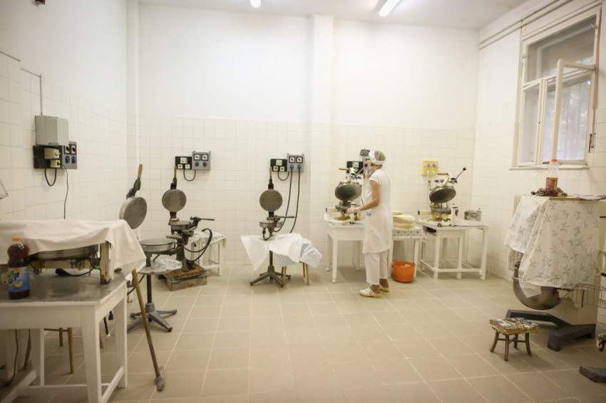 A keverés után a sütés következik. A legrégibb, ma is használatban levő sütőgép 1964-es, a legújabb 1995-ös. Három nagy és három kicsi gép van, ezekbe öntik a kizárólag búzalisztből és vízből készült, palacsintatészta-szerű masszát. Általában heti három nap sütnek, a további két nap vágással, válogatással és csomagolással telik. Ünnepek előtt azonban mindennap kell sütni is. Naponta négy-ötszáz ostyalap sül ki.