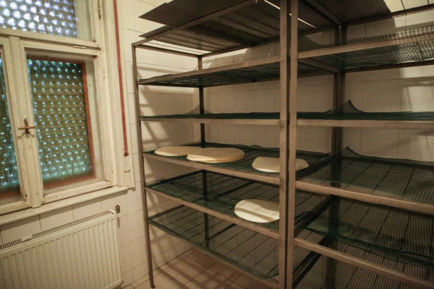 A következő munkafázis a párásítás, amely már odafönt történik. A kilencven-száz százalékos páratartalmú helyiségben hat-nyolc, sőt télen akár nyolc-tíz órát is el kell tölteniük a kisült lapoknak, hogy rugalmassá váljanak, és ne törjenek, amikor a vágás következik.