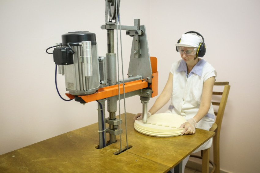 A párásító melletti helyiségben két gép van. Az egyik picike; úgy kell odaülni hozzá, mint egy varrógéphez, és mechanikusan, lábbal működtethető. A másik jóval nagyobb, sőt kissé félelmetes is; a hivatalos elnevezése ostyafúró berendezés, de Csilla Gézának nevezte el. Ez elektromos, félautomata szerkezet, és akár tíz-harminc lap „átfúrására” is képes, attól függően, mennyire vastagok. Hiába figyelmeztet Angéla, hogy veszedelmes a hangja, és a röpködő ostyadarabkák miatt a védőszemüveg használata is ajánlott lenne, mi nagy merészen bennmaradunk, hogy mindent lássunk – ám amikor bekapcsolják, én pánikszerűen kimenekülök, a zúgása annyira mélyen, kíméletlenül a fülbe-fejbe kúszik. A fotós kolléga azonban hősiesen tűr, hogy minden munkamozzanatot megörökíthessen.