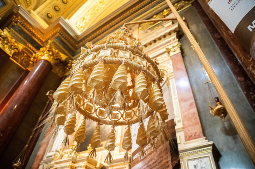 Az aratókoszorút Mohos Gábor esztergom-budapesti segédpüspök, a Szent István-bazilika plébánosa vette át, aki imádságban kérte a Jóisten áldását, majd a könyörgést követően áldást mondott az aratókoszorúra.