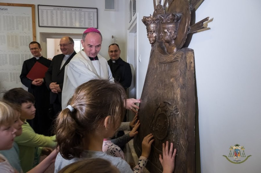Udvardy György végül bátorította a gyerekeket és szüleiket, hogy amikor az iskolába érkeznek, vagy távoznak onnan, bátran érintsék meg a Szűzanya szobrát egy köszöntés, egy fohász kíséretében. „Szeretnénk, hogy bátor bizalommal forduljatok Jézushoz Márián keresztül” – tette hozzá a püspök, majd a közös imádság után megáldotta a diákokat és a szobrot.