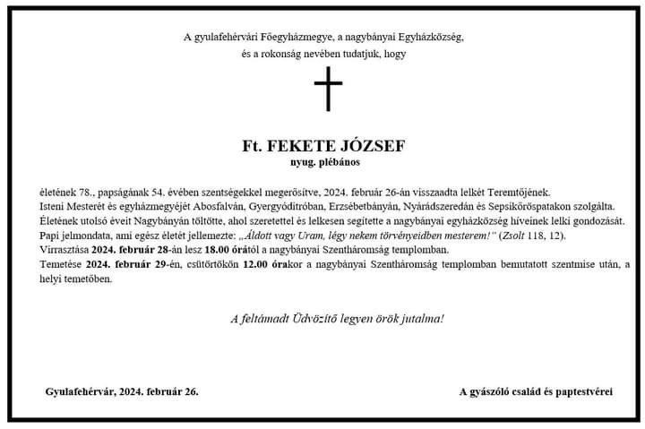 Február 28-án 18 órától virrasztanak érte a nagybányai Szentháromság-templomban. Temetése február 29-én, csütörtökön 12 órakor a nagybányai Szentháromság-templomban bemutatott szentmise után, a helyi temetőben lesz.
