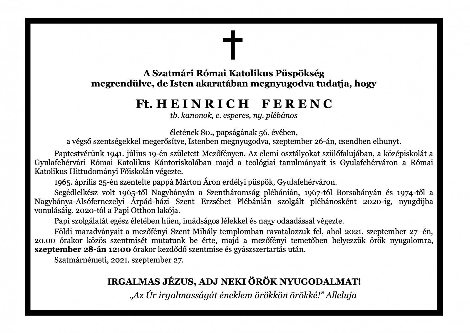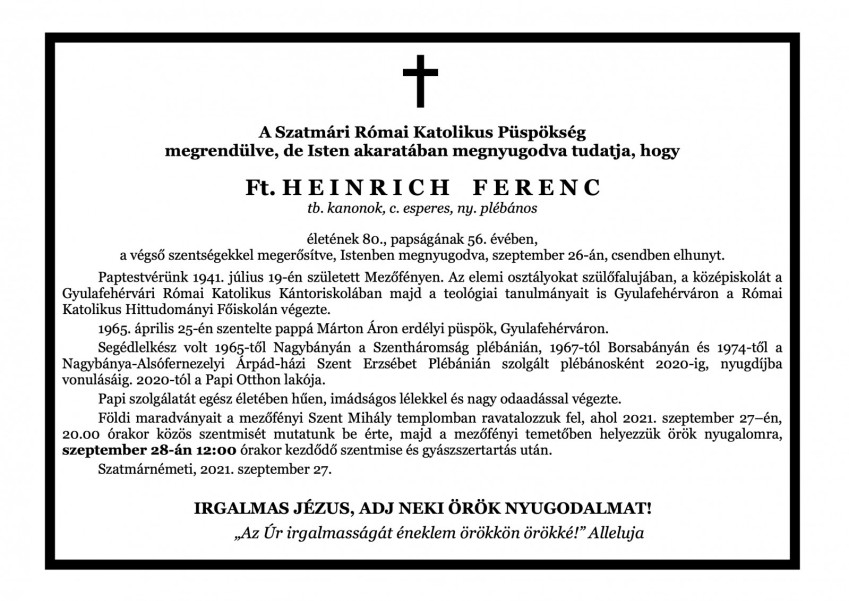 Heinrich Ferenc földi maradványait szeptember 27-én a mezőfényi Szent Mihály-templomban ravatalozzák fel, és 20 órakor szentmisét mutatnak be lelkiüdvéért. Szeptember 28-án a 12 órakor kezdődő szentmise és gyászszertartás után helyezik örök nyugalomra a mezőfényi temetőben.