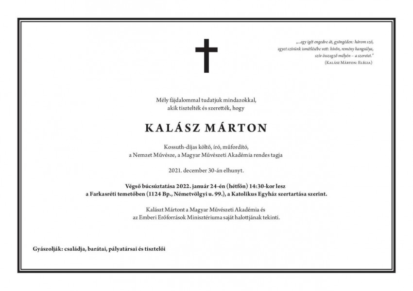 Kalász Mártont december 30-án, csütörtökön Budapesten érte a halál. Az alkotót az MMA saját halottjának tekinti.