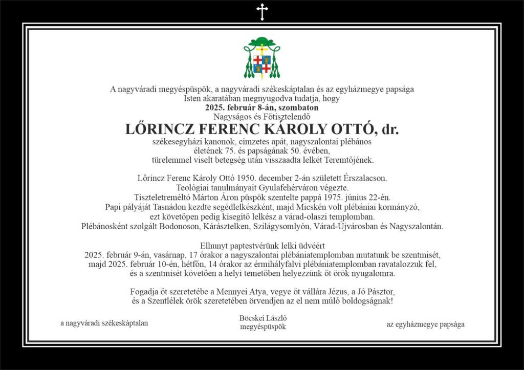 Az elhunytért február 9-én, vasárnap 17 órakor a nagyszalontai plébániatemplomban mutattak be szentmisét, majd február 10-én, hétfőn 14 órakor az érmihályfalvi plébániatemplomban ravatalozzák fel, és a szentmisét követően a helyi temetőben helyezik örök nyugalomra.