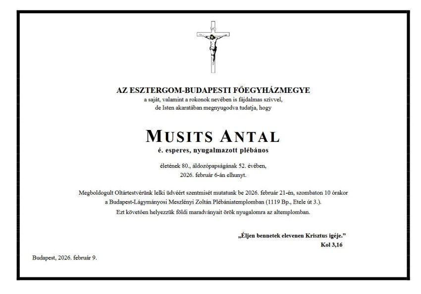 Musits Antal 1946. július 7-én született Budapesten. 1974. június 21-én szentelték pappá Esztergomban.