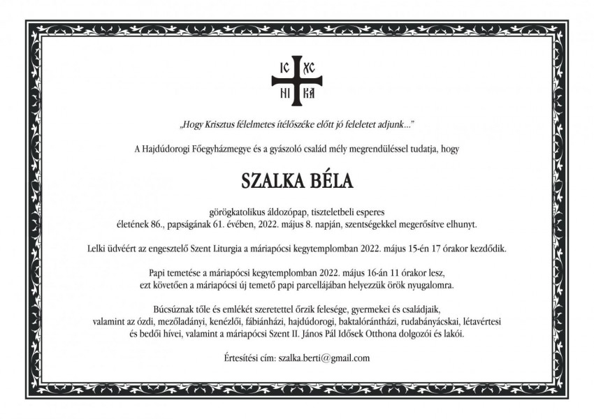 Búcsúznak tőle és emlékét szeretettel őrzik felesége, Bihari Katalin, gyermekei és családjaik; az ózdi, mezőladányi, kenézlői, fábiánházi, hajdúdorogi, baktalórántházi, rudabányácskai, létavértesi és bedői hívei, valamint a máriapócsi Szent II. János Pál Idősek Otthona dolgozói és lakói.
