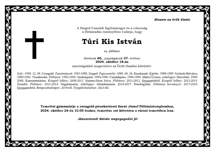 Temetési gyászmiséje a csongrád-piroskavárosi Szent József-templomban október 24-én 10 órakor, ezt követően a városi temetőben kísérik utolsó útjára.