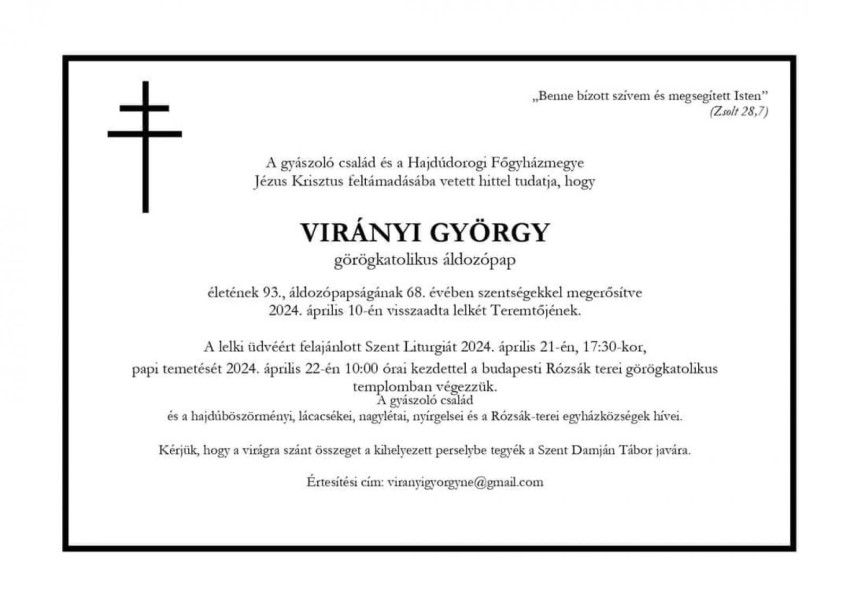 A lelki üdvéért felajánlott Szent Liturgiát április 21-én 17.30-kor, papi temetését április 22-én 10 órakor a budapesti Rózsák terei görögkatolikus templomban végzik.