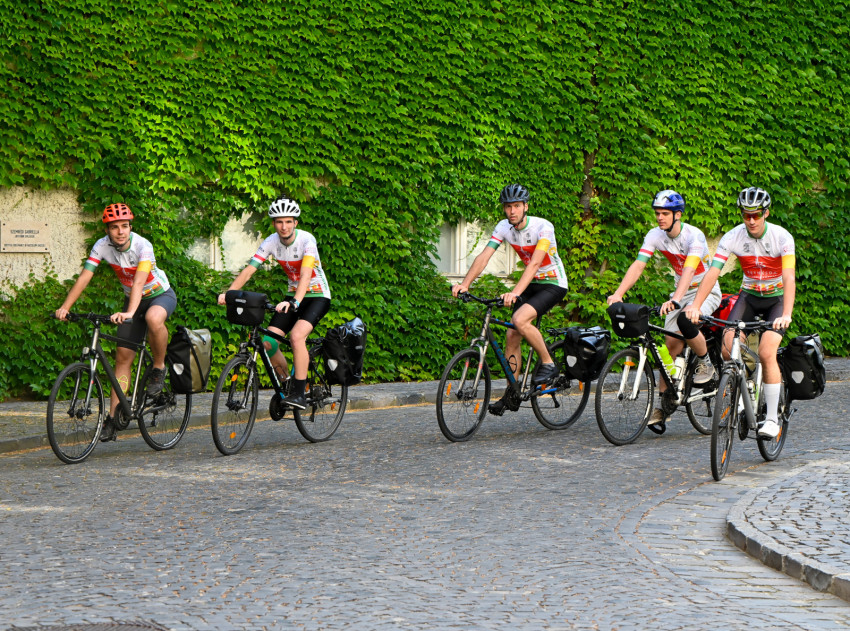 Június 25-én hajnalban a Pannonhalmi Főapátság falai alól indultak útnak a fiúk: Knáb András (24), Nádudvari Csongor (23), Szép Levente (22) és Bódy Ágoston (22) „Minden út, ami nem Rómába vezet, az Pannonhalmára” – állapította meg viccelődve az ötödik útitárs, Geri Kolos, akivel Münchenig egészül ki a csapat. Ő a legfiatalabb kerékpáros, néhány napja végzett a szóbeli érettségikkel. Kolos végzősként elnyerte a gimnázium ösztöndíját, így az egyetem előtt egy évet Amerikában, a bencés Saint Vincent College-ban tölthet. A pennsylvaniai kaland előtt számos elintéznivalója akad még, így a 40 napos zarándoklatot egészében nem tudta vállalni.