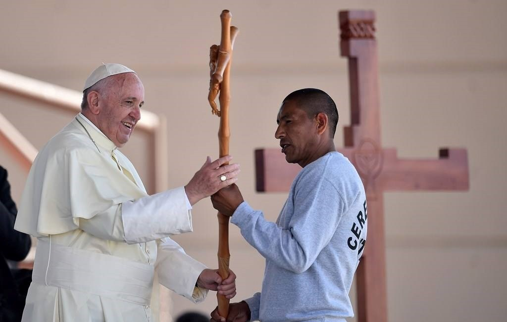 Ferenc pápa egy kristályfeszületet ajándékozott a büntetés-végrehajtási intézménynek, míg ő maga egy fából készültet kapott ajándékba a fogvatartottaktól.