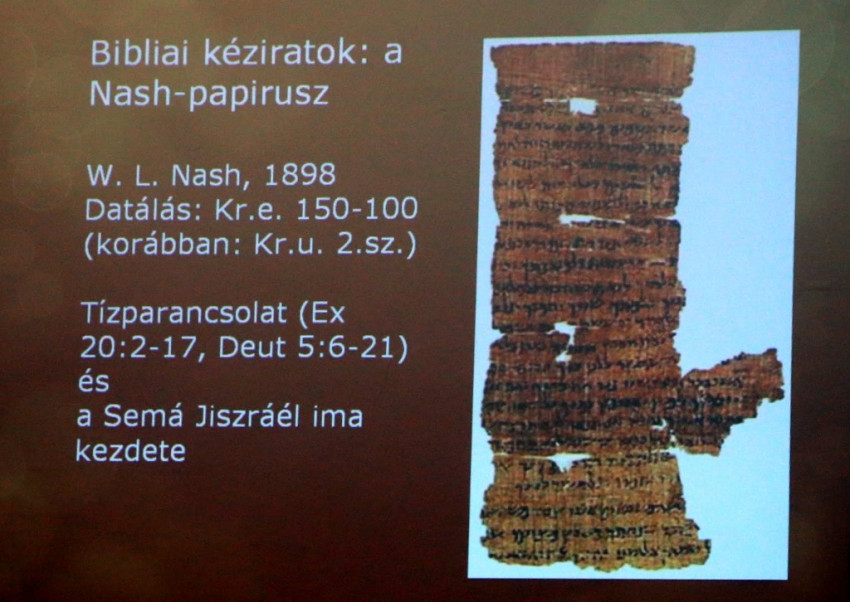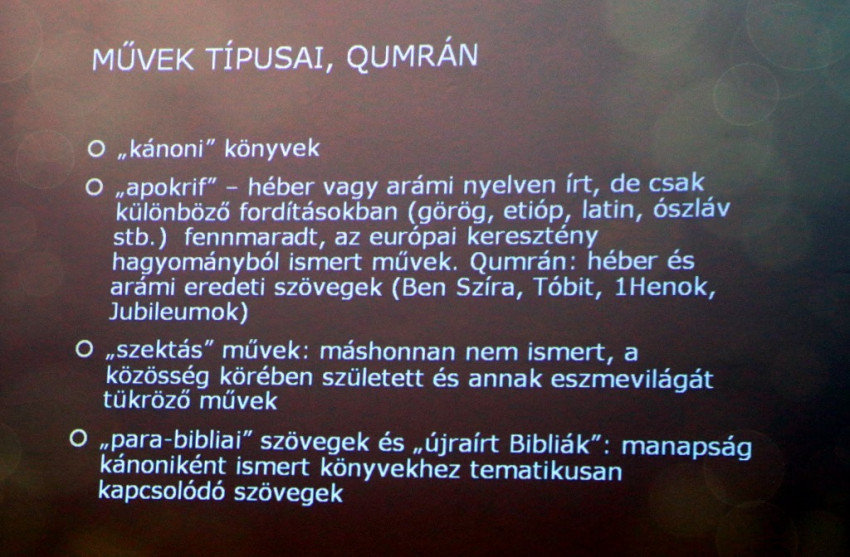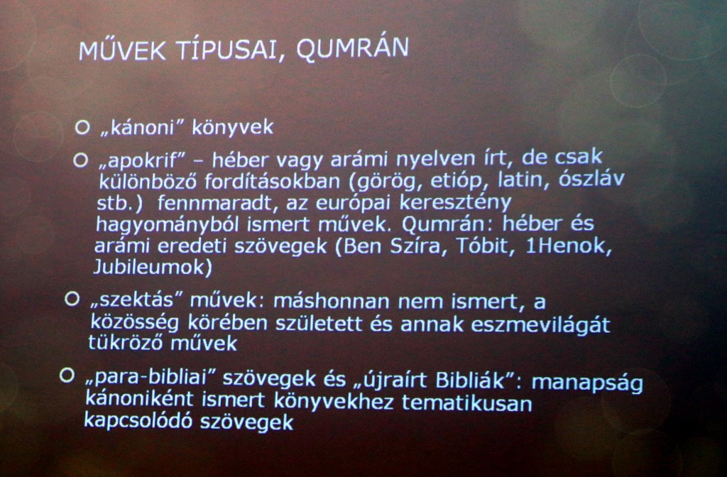Fröhlich Ida előadásában elmondta, hogy a ma ismert legrégebbi bibliai kéziratokat a qumráni közösség könyvtárából ismerjük, ahol – Eszter könyve kivételével – a ma héber bibliai kánonként ismert gyűjtemény összes könyvét megtalálták, legtöbbjüket több példányban is. A kéziratok a „kánoni” könyvek mellett máshonnan nem ismert para-biblikus szövegeket, „apokrif” művek héber és arámi eredetijeit, valamint a közösség eszmerendszerét tükröző „szektás” műveket tartalmaznak.