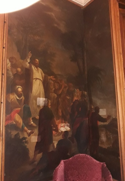 Megfigyelhető, hogy a Pál apostol életeseményeit ábrázoló festmények nincsenek kronológiai sorrendben: a hat darab nem időrendi sorrendben követi a szent életét és a cselekményeket. Amennyiben a díszterem irányából kezdjük meg a festmények leírását, a sarokképpel kell kezdeni: a festmény témája „Beszéd az Aeropagon”.