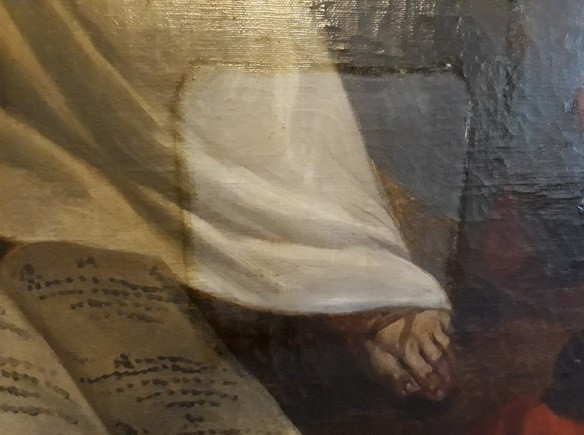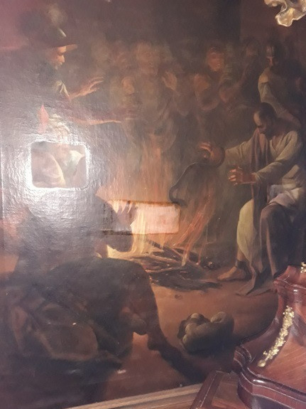 A falszegmens két festményt ábrázol: az ablaktól jobbra a kígyómarást – Pált hajótörése után a máltaiak szeretettel fogadták, nagy tűz mellett melegedett fel hajótörött társaival együtt; a tűz mellett melegedve kígyó marta meg. A körülállók gyilkosnak hiszik: a hajótörést túlélte, s egy kígyó végez vele? Lukács érzékletesen írja le a döbbenetet, Dorffmaister hasonlóan drámaian festi meg a cselekményt.