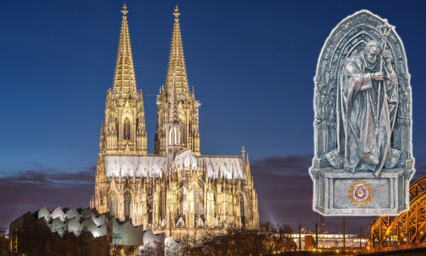 Az ereklyetartó egy 40 centiméter nagyságú szobor, melyet szemmagasságban rögzítettek a dóm falán, hogy a hívők megérinthessék. Az ereklyetartó a düsseldorfi szobrász, Bert Gerresheim alkotása: egy dóm kapujában, keresztjére támaszkodva ábrázolja Szent II. János Pált, emléket állítva a pápa 1980 novemberében tett kölni látogatásának.