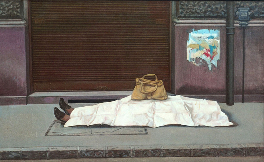 A kiállítás címe – Elmozdul a fal – nagyon találó, hiszen a templomtérben a kurátorok valóban elmozduló installációt hoztak létre. Egy kanyargós emberi sors szimbolikus kifejezése is lehet ez: elindulunk, és sokszor hosszas keresgélés után rátalálunk az áhított célhoz vezető útra. Persze ez nem mindenkinek adatik meg, de úgy tűnik, Mácsai Istvánnak sikerült. A látogatónak ugyanakkor erősen figyelnie kell a tárlaton, mert a sejtelmes megvilágításban könnyen elkerülheti a figyelmét néhány, a falon magányosan logó kép. Mint például az egyik legmegrázóbb, a Pesti halál című festmény, amely lakonikus egyszerűséggel, már-már közömbösnek ható belenyugvással mutatja meg a járdán kiterített, fehér csomagolópapírral letakart testet. Egy asszony fekszik ott, látszik a cipőjéről és a hastájékra helyezett női táskáról – elképesztő a látvány. A háttér sem biztató, a lehúzott rozsdás vasredőny és a falon a megtépázott hirdetmény csak ráerősít a szomorú eseményre.