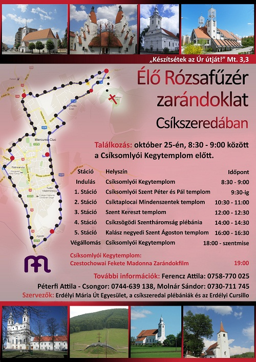A zarándoklat állomásai a következők: csíksomlyói Szent Péter és Pál-templom, csíktaplocai Mindenszentek-templom, csíkszeredai Szent Kereszt-templom, csíkzsögödi Szentháromság-templom, csíkszeredai Szent Ágoston-templom, csíksomlyói kegytemplom.