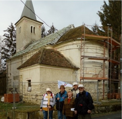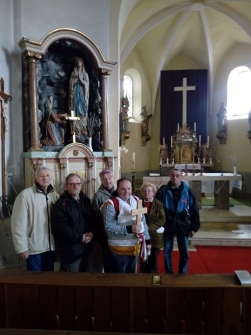 Az utolsó állomásunk Cák volt. A Hordómosó-forrásnál kis pihenőt tartottunk, majd a rózsafüzér utolsó tizedeit a templomban mondtuk el. Itt is felújítás zajlik. Cák után a hagyományos túra- és zarándokutat a Pogány-hegy felé átjárhatatlan szederindás, mocsaras magánterület zárta el, ezért vissza kellett fordulnunk. E megpróbáltatást igazi böjti lelkülettel viselte a négy fővel bővült csapat.