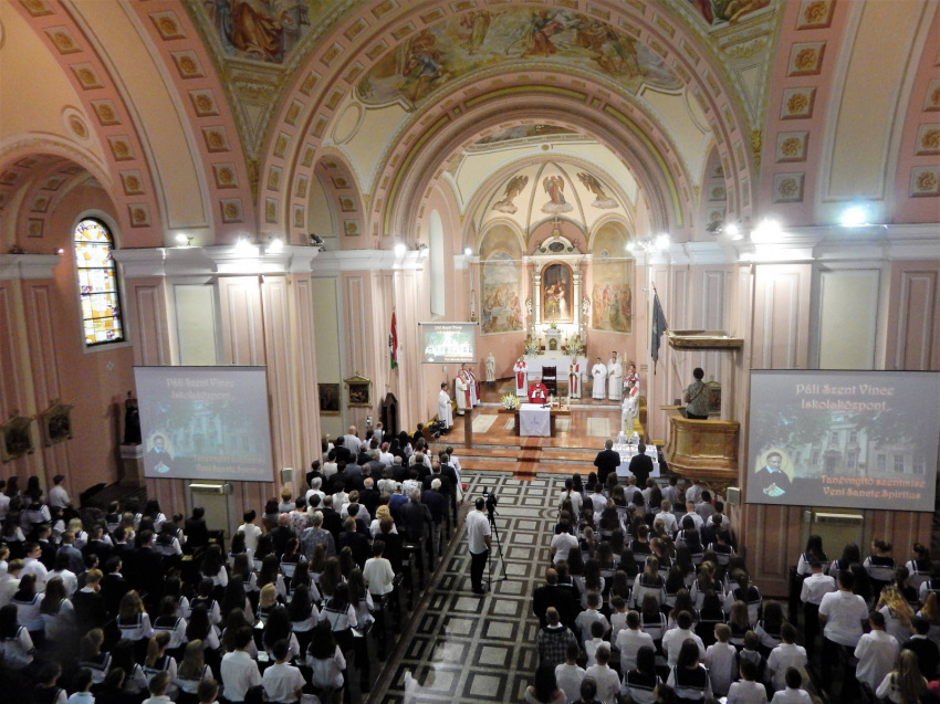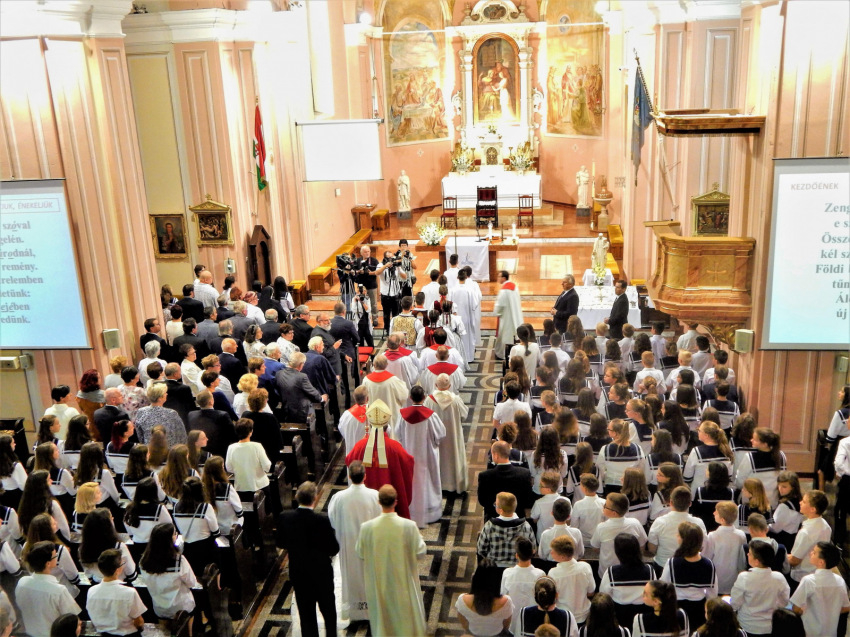 Szakadó esőből lépünk be a templomba, ahol először ünnepelnek Szentlelket hívó tanévnyitó szentmisét gimnazisták ezen a hétfő reggelen. „Összegyűltünk oltárodnál, kél szívünkben új remény” – hangzik el a kezdőénekben, s valóban, az oltár köré gyűlt közel négyszáz diák és tanáraik, ez a közösség, mely a már több mint negyedszázados katolikus általános iskolához csatlakozott most, új remények hordozója lehet.