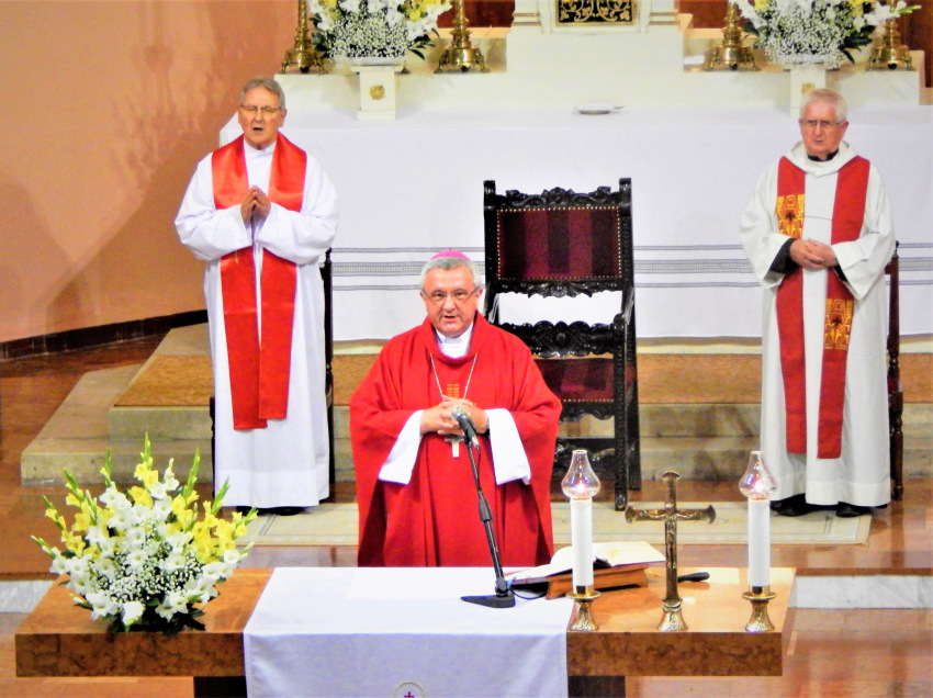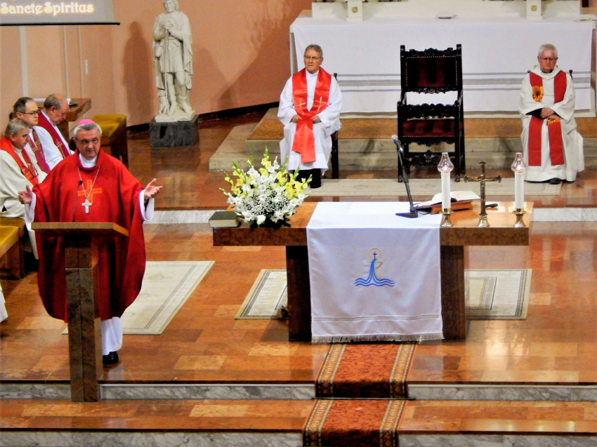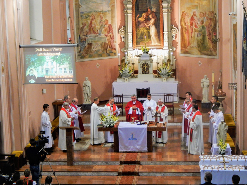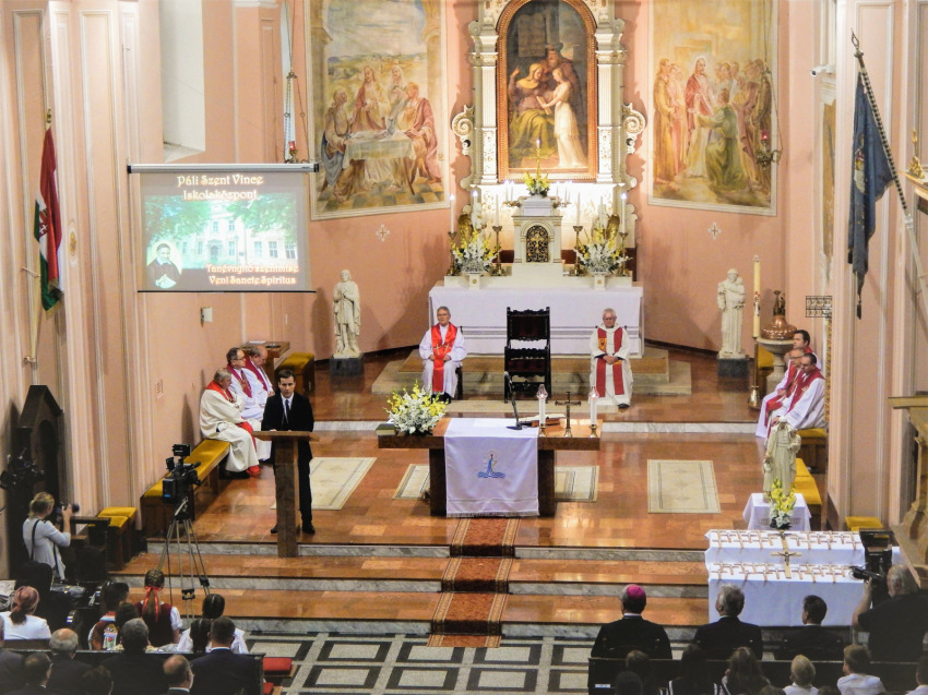 Az ünnepség az új katolikus iskolaközpont zászlaja és a gimnázium tantermeinek falára kerülő keresztek megáldásával folytatódik a templomban, majd az épület megáldásával zárul a gimnáziumban. A befejezésként, s mintegy hálaadásként is megszólaló népdalban fohász hangzik az iskoláért: „rajta ott lobogjon üdvösség zászlója”. Ebben a pontosan érkezett őszben, a Szentlelket segítségül hívó szép liturgia végén az evangéliumi mondatokra gondolok: „A szél ott fúj, ahol akar. Hallod a zúgását, de nem tudod, honnan jön, és hová megy. Így van mindaz, aki a Lélektől született.” A Lélek lobogtatja azt a zászlót is.