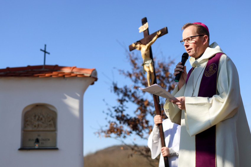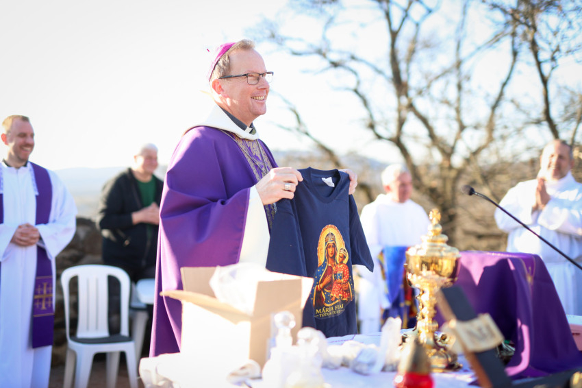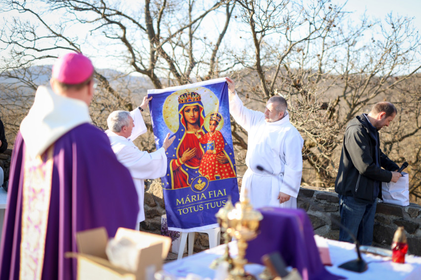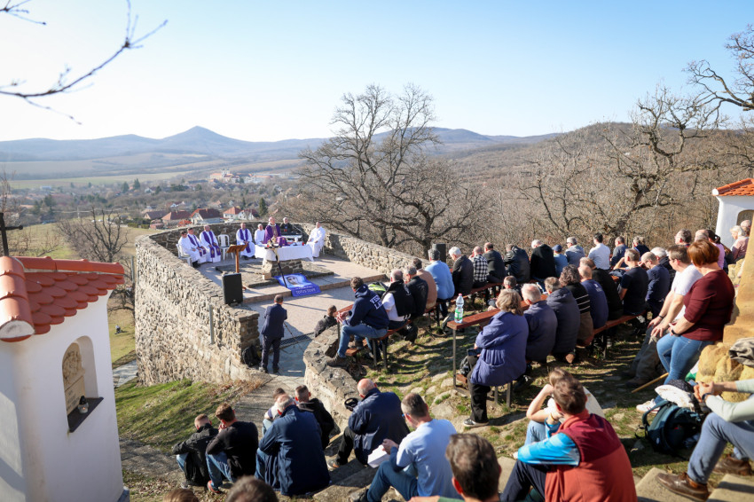 A program a kálvária keresztúti állomásainak végigjárásával folytatódott, majd a hegytetőn bemutatott szentmisén Fábry Kornél püspök a tékozló fiú evangéliumi történetét állította a középpontba. Rámutatott, hogy a példabeszéd szereplőiben – legyen szó a válaszút előtt álló fiúról vagy az irgalmas atyáról – saját életállapotunkra ismerhetünk rá. A püspök beszédében kiemelte: személyes megújulásunk, az életszentség nem egy távoli, elérhetetlen ideál, hanem a mindennapok következetes döntéseiben dől el. Mindennap újra meg kell erősítenünk Istennek tett ígéretünket. Fábry Kornél hangsúlyozta, hogy