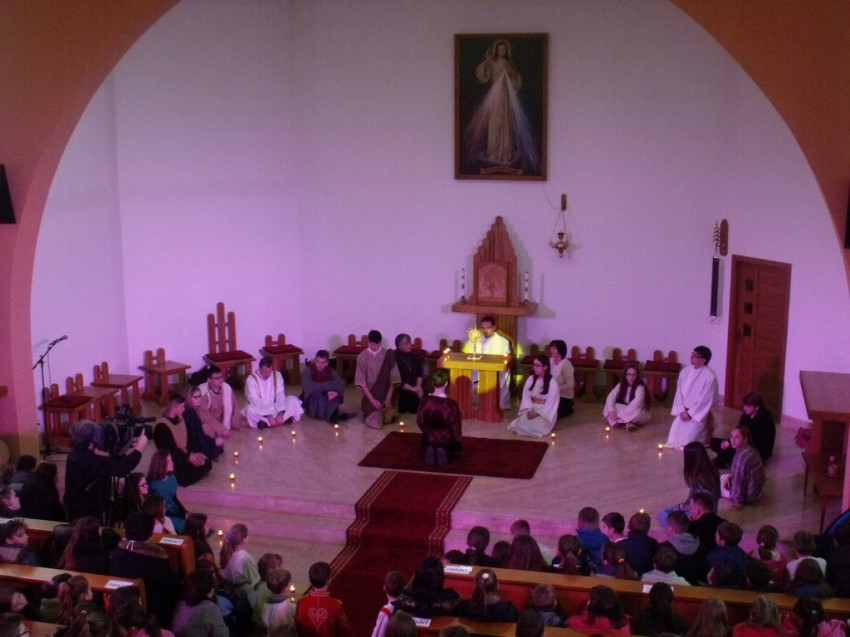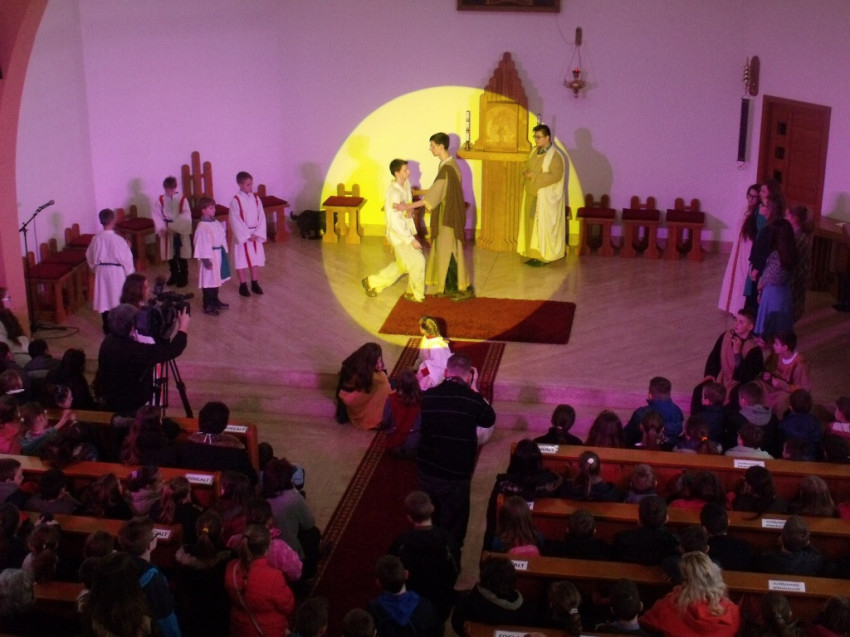 A leendő elsőáldozók és bérmálkozók átlépték az irgalmasság kapuját, majd Tóth László plébános köszöntötte őket. A találkozó rendhagyó módon Az Irgalmas Atya című zenés misztériumjátékkal folytatódott, amelyet hat egyházközségből (Nyíregyháza, Nyíregyáza-Sóstóhegy, Borbánya, Örökösföld, Pócspetri, Nyírtelek) verbuválódott hittanos gyermekek adtak elő. A mintegy öt héten keresztül tartó, ötven főt megmozgató „Irgalmasság-projektben” a próbák más-más plébániatemplomban zajlottak, így a felkészülésben nemcsak a szereplők, hanem a rokonok, a templom körüli szolgálatot végzők is részt vettek.