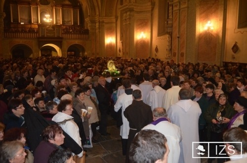 A szentmisét követően Urbán Erik ferences templomigazgató vezetésével a gyergyóditrói fiatalok végezték a rózsafüzér imádságot, majd a gyertyás körmenet során székely ruhában vitték a kegyszobor mását.