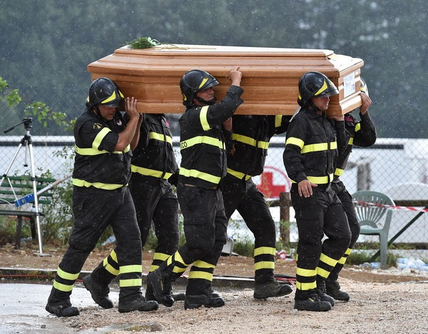 Az állami szertartást eredetileg a közeli nagyobb város, Rieti repülőterén akarták megtartani, de a hozzátartozók tiltakozása miatt a kormány engedett, és a romba dőlt Amatrice egyik sportpályáján rendezték a ceremóniát. Ezen a helyen rendeztek be önkéntesek ideiglenes sátortábort is a fedél nélkül maradtaknak.