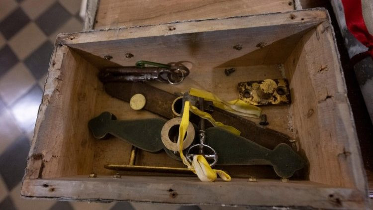A kulcson kívül a dobozból előrekültek a szent kapu kilincsei, a pergamen, ami a bezárást igazolja, négy aranyozott tégla és néhány érem, többek között Ferenc pápa, XVI. Benedek és II. János Pál idejéből.