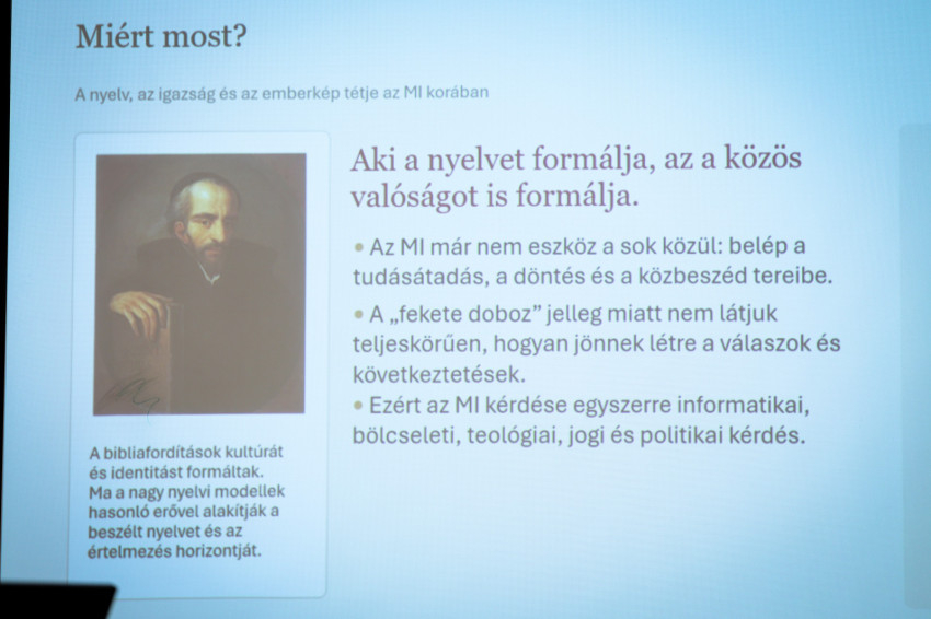 Birher Nándor, a PPKE BTK dékánja a projektet bemutatva arra emlékeztetett, a 400 éve megjelent Káldi György-féle Biblia is egy nagy horderejű technológiai újítás, a könyvnyomtatás eredménye volt. A korszak felismerése volt, hogy aki a nyelvet formálja, a közös valóságot is alakítja. Napjainkban az MI már nem csak egy eszköz a sok közül, belépett tudásátadás, döntés és közbeszéd tereibe. A dékán rámutatott,