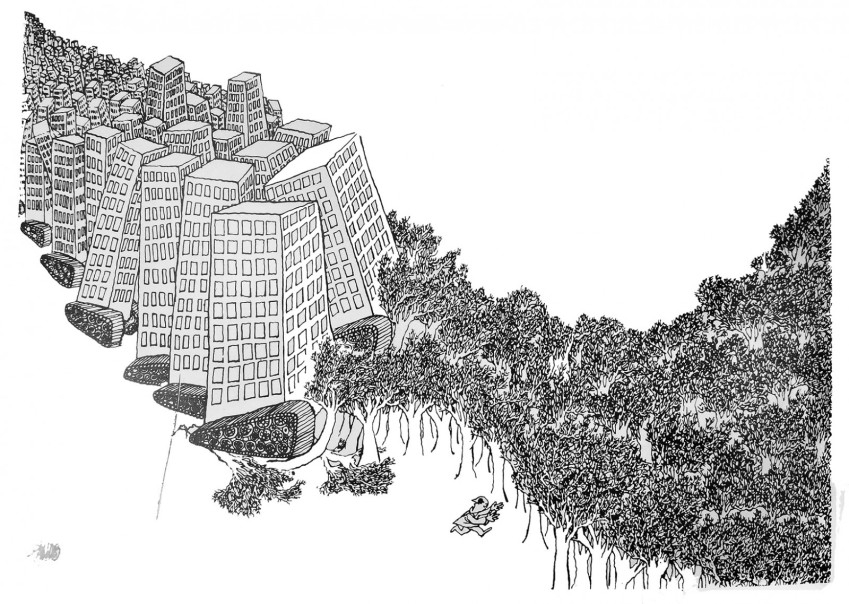 Egy másik rajzon, amely a Velence megmentéséért címet viseli, a Szent Márk teret és a bazilikát elönti a tenger, a gondolában egy kalapos férfi igyekszik összefércelni a hajó szétfoszlott orrát. Akkoriban még nem féltették annyira Velencét, mint manapság. Harc ez a javából, a technikai fejlődés bűvöletében élő, kiszolgáltatott kisember küzdelme az életben maradásért. Dallos Jenőnek ezek a rajzai 1973-ban készültek, amikor még úgy tűnt, a fejlődés töretlen, a növekedésnek nincsenek határai. Akkor még szó sem volt arról, hogy az ember lakhatatlanná teheti a bolygót, amelyen él. Nemhogy klímaváltozásról, de még környezetvédelemről sem nagyon beszélt senki. Dallos Jenő karikaturista látnoki erővel már akkor figyelmeztetett a rajzain keresztül a Földet fenyegető veszélyre, és ez csupán két alkotása a sok közül.