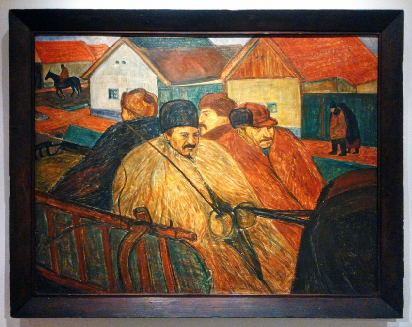 Kurucz D. Gubások című képe jellegzetes alkotás. Az egyszerű parasztházak között haladó szekéren talán éppen a földekre tartanak a népviseletbe, színes gubába öltözött parasztok. A durva farostlemezre festett olajtempera, a kissé nyers, nem is festői, inkább rajzos jellegű megfogalmazás jól kifejezi az alföldi életmód lényegét.