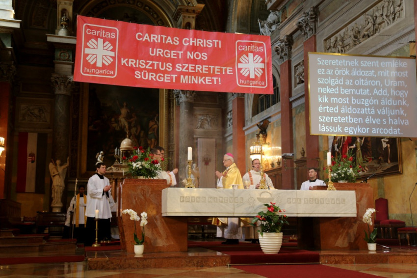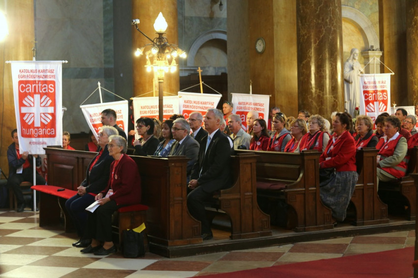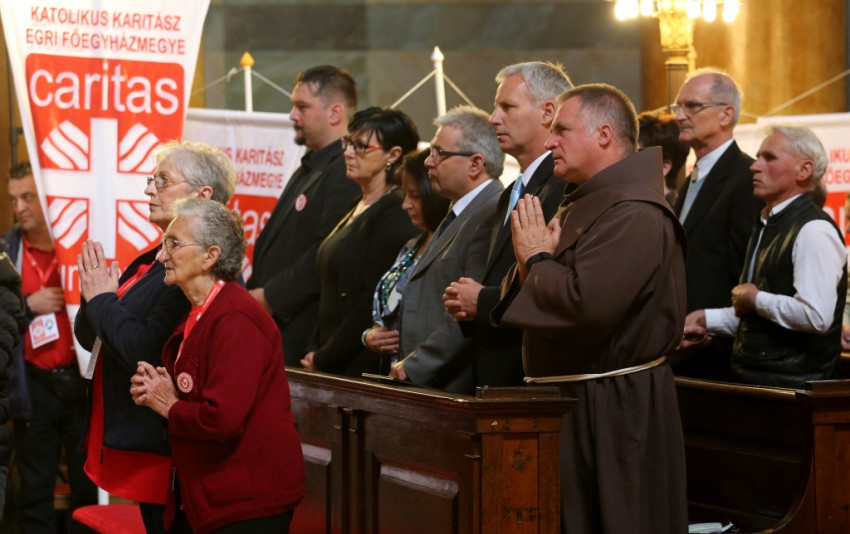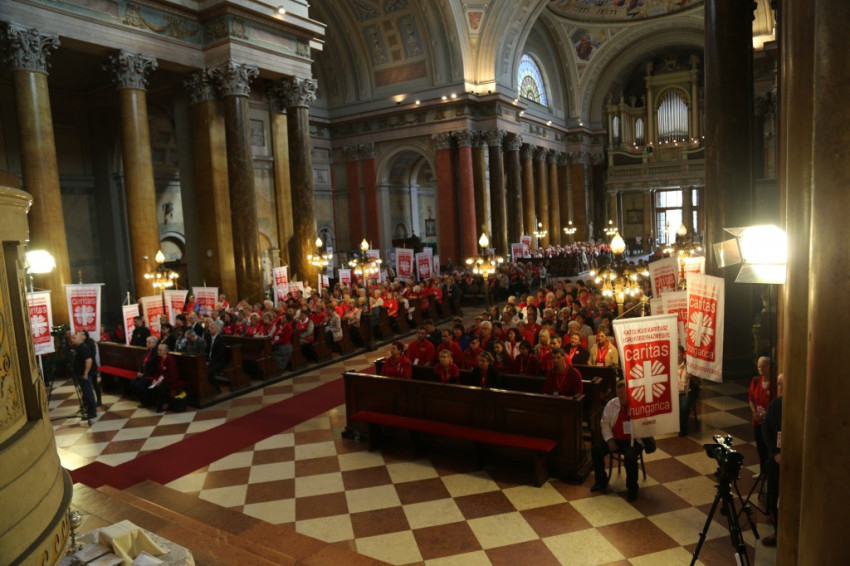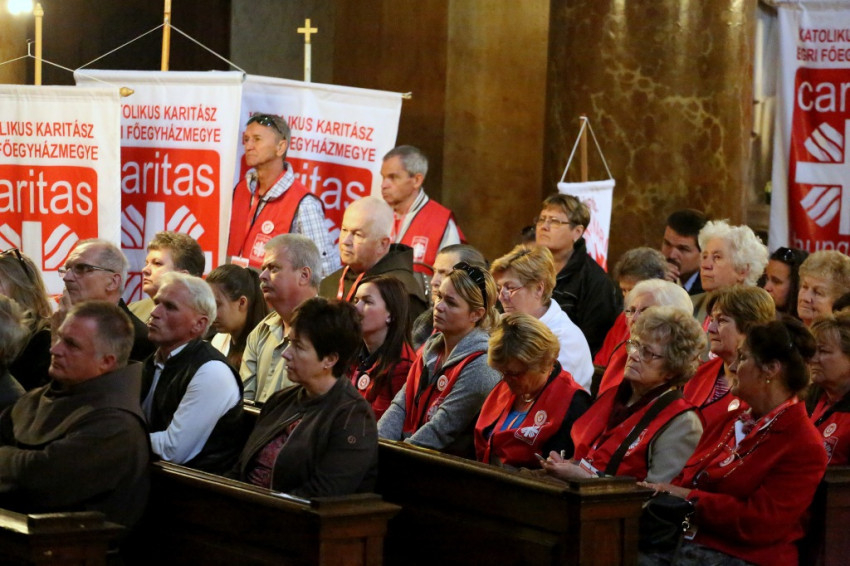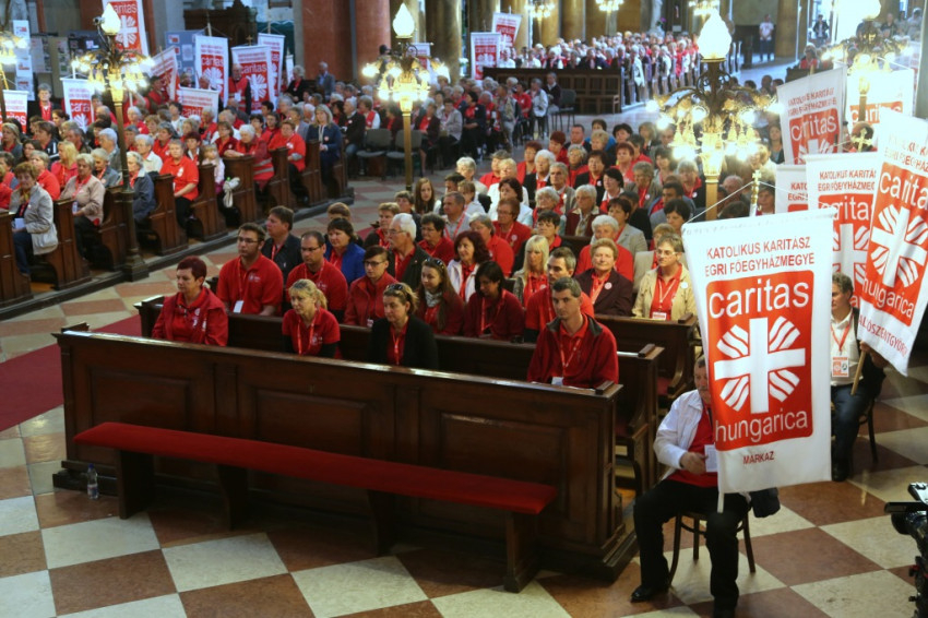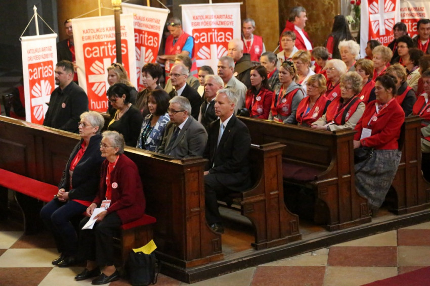 A bazilikába az érseki palotától vonultak be a katolikus segélyszervezet jól ismert zászlajával a nemzetközi karitászmozgalom lángoló keresztet ábrázoló jelzésével ellátott, piros színű mellényt viselő csoportok. A program szentmisével kezdődött, melynek főcelebránsa Spányi Antal püspök volt, koncelebrált Ternyák Csaba érsek és Katona István nyugalmazott egri segédpüspök, valamint a csoportokkal érkezett számos lelkipásztor. A szentélyben felirat figyelmeztetett a karitatív tevékenység forrására és fontosságára: „Krisztus szeretete sürget minket.”