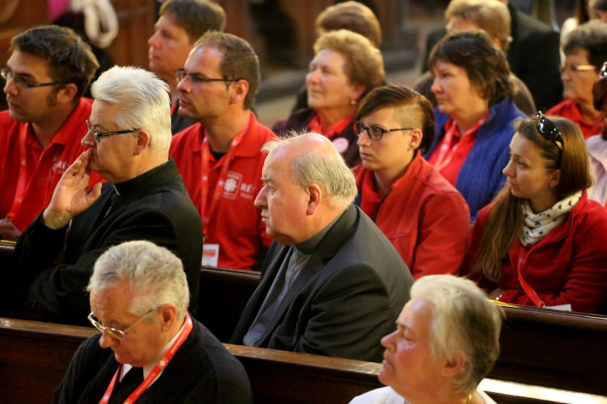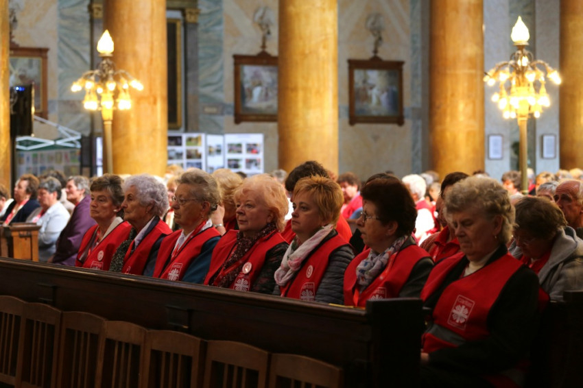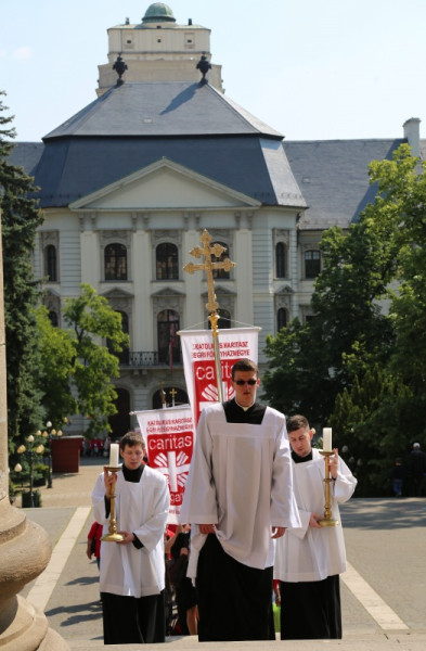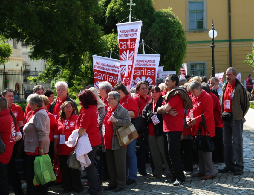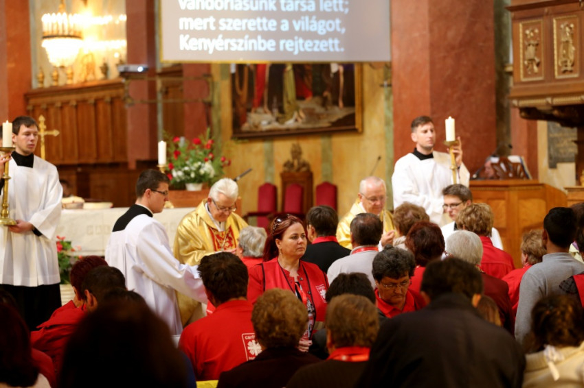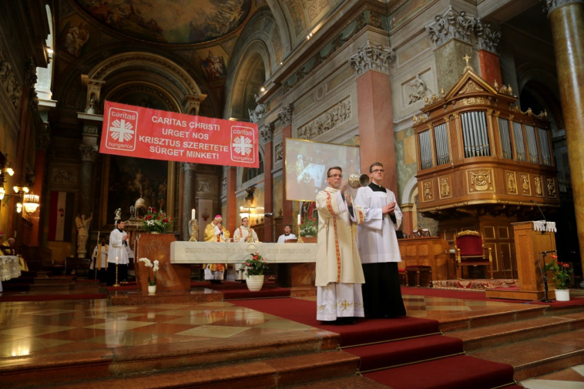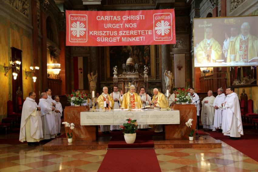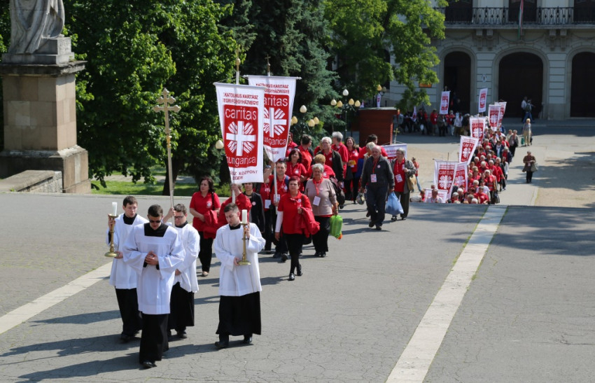 A bazilikába az érseki palotától vonultak be a katolikus segélyszervezet jól ismert zászlajával a nemzetközi karitászmozgalom lángoló keresztet ábrázoló jelzésével ellátott, piros színű mellényt viselő csoportok. A program szentmisével kezdődött, melynek főcelebránsa Spányi Antal püspök volt, koncelebrált Ternyák Csaba érsek és Katona István nyugalmazott egri segédpüspök, valamint a csoportokkal érkezett számos lelkipásztor. A szentélyben felirat figyelmeztetett a karitatív tevékenység forrására és fontosságára: „Krisztus szeretete sürget minket.”