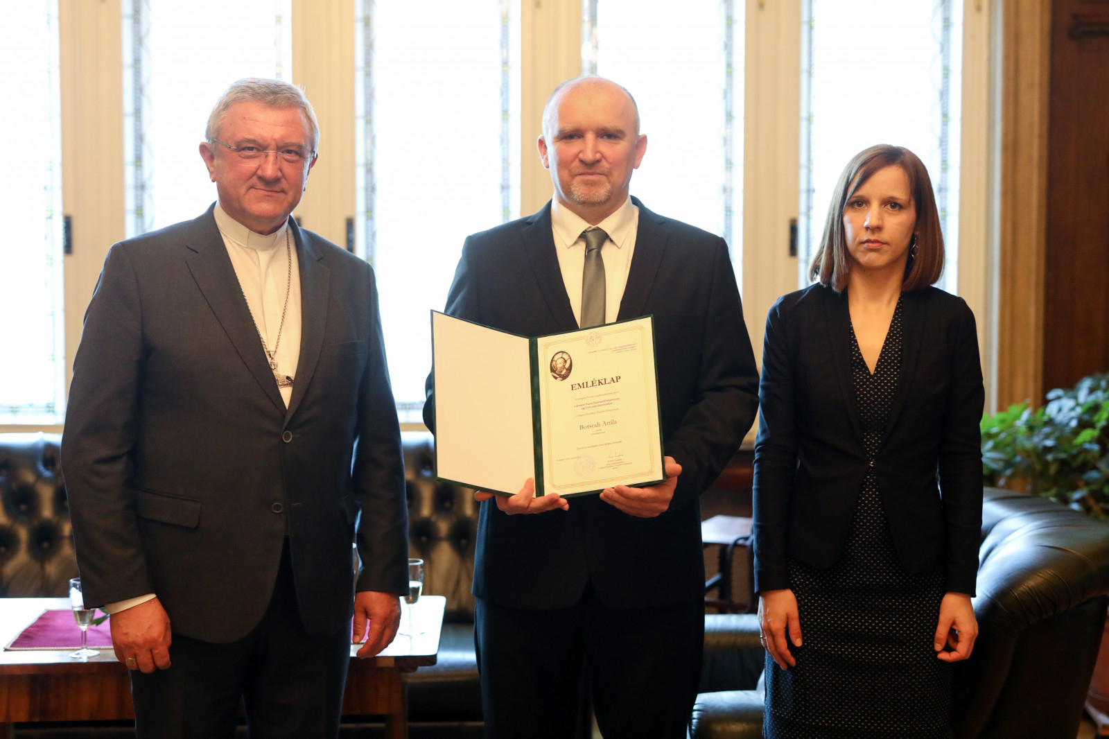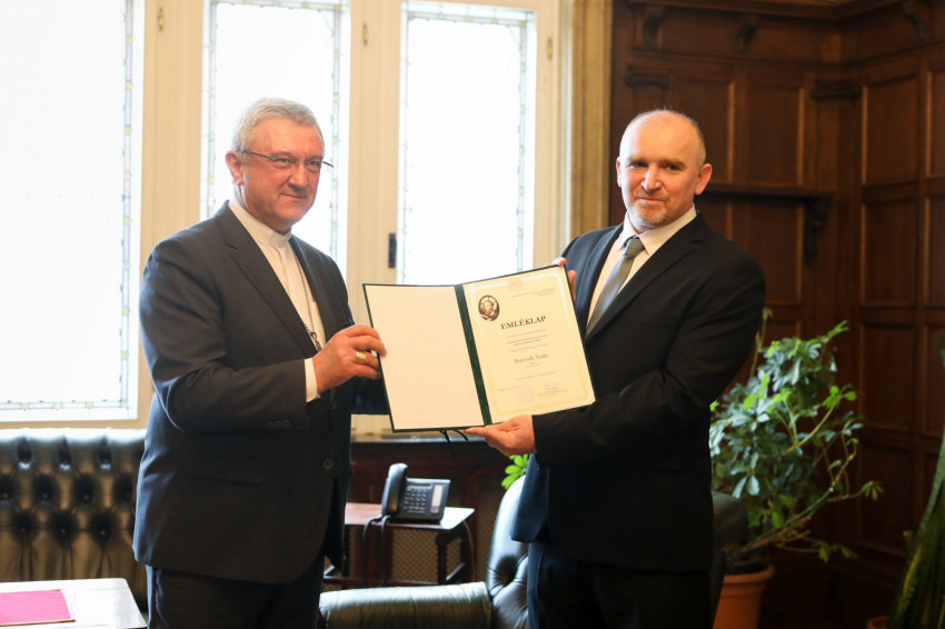Tudjuk, a szó is tud ölni, nem csak a fegyver. Akkor helyes, ha azzal mindig építünk, akár személyiséget, személyt, akár közösséget, de mindig pozitív üzenetet adunk, hogy akiről szólunk, azt is magasabb értékre tudjuk emelni, és különösen azokat, akikhez szólunk – fogalmazott a püspöki konferencia elnöke, aki beszéde után átadta a díjat Borsodi Attilának.