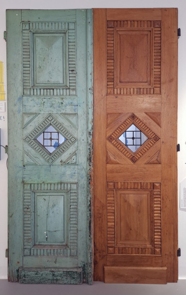 Ha továbbmegyünk, láthatunk a tárlaton egy fából készült kétszárnyas kaput is, amely az 1870-ben épült, majd 2021-ben lebontott, Tömő utca 23/a szám alatti lakóház bejárata volt. Psota Irén színésznő egykori lakóházának bontásából mentették meg ezt az eredeti nyílászárót, és felajánlották az induló múzeumnak. Így ez a műtárgy lett a gyűjtemény első darabja. Psota Irén gyerekkorától a főiskolás éveinek megkezdéséig élt a Tömő utcában.
