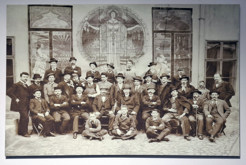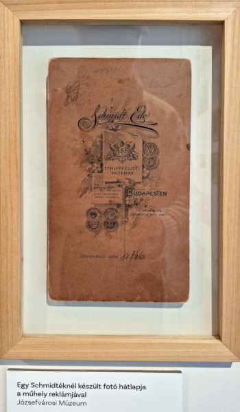 Persze fotóműterem is működött a kerületben, mégpedig a Baross utcában. Egy korábbi, 22. kerületi témával foglalkozó cikkünkben írtuk Bíróné egykor nagyon népszerű, ma már nem létező fotóüzletéről. Ahhoz hasonló volt Schmidt Ede (1857–1933) 8. kerületi műterme, amely a mai Diószegi utcában állt. A fényképész később, az akkor éppen kiépülő Nagykörút közelében, a mai Baross utca 61. szám alatt nyitott fényképészeti műhelyt. Az eredeti ház ma már nem áll, helyére 1970-ben pártszékház épült. A kiállításon régi műtermi fotókat láthatunk, és megnézhetjük a Schmidt Edénél készült fotó csoda szép szecessziós rajzolatú hátlapját is.