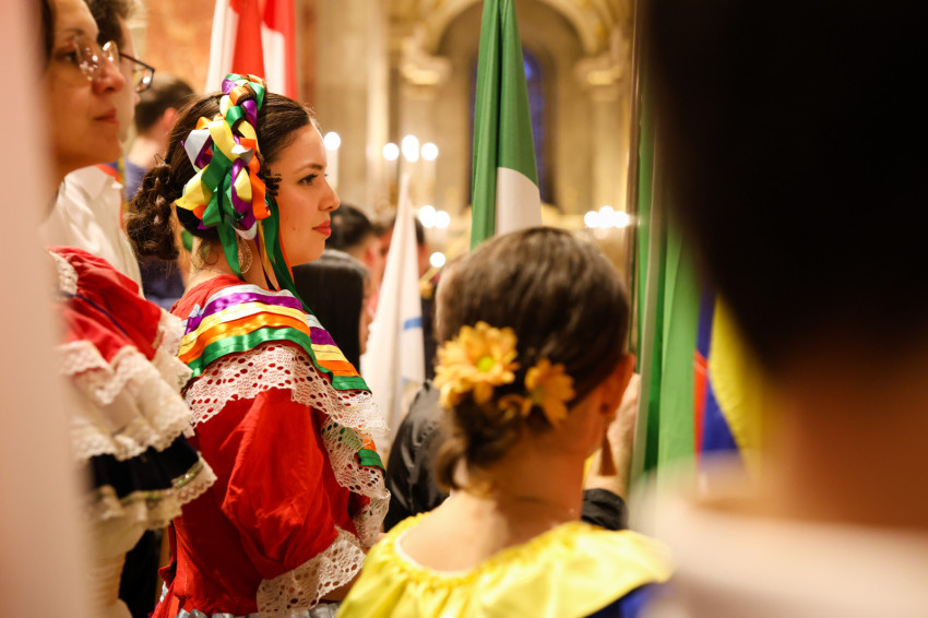 A Laudate Dominum kezdetű taizéi ének ünnepélyes orgonakíséretére bevonultak a különböző idegen nyelvű közösségek képviselői zászlóikkal, változatos öltözékekben, népviseleteikben, valamint a püspökök és számos pap, az idegen ajkú Magyarországon élő és a külföldi magyar közösségek lelkipásztorai.