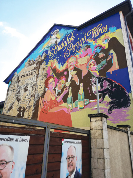 Úgy látszik, a kerületi önkormányzat döntéshozói az utóbbi évtizedben kedvet kaptak a nagy méretű színes falképek meghonosításához. Az üres, kopott, barátságtalan tűzfalak helyett afféle képregényszerű rajzokat, festményeket látni sokkal üdítőbb élmény. Budafokon egyre több ilyen murália készül. A Kossuth utcai általános iskolával szemben is felfedezhetünk kettőt, egymástól nem messze. Kissé ugyan el vannak dugva, de ha figyelmesen közlekedünk, észrevehetjük őket. Az egyiken a Törley-kastély egy részletét láthatjuk, s mellette egy vidám társaságot, amelynek tagjai jókedvűen pezsgőznek a nyári éjszakában. Fejük fölött a felirat hirdeti: „Budafok Pezsgő Város”. A kép jobb oldalán egy pohárból szenvedélyesen lefetyeli a pezsgőt egy fekete macska.