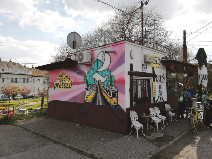 Korántsem ez az egyetlen, nevezzük így, utcai grafika, amit gyakran összefirkáltak, elcsúfítottak az utóbbi időben. Amikor a Savoya park mellett a felüljárón villamossal utazunk keresztül Budafok felé, az elágazásnál találjuk a Két megálló presszót, ahová sokan betérnek egy pofa sörre vagy kettőre, különösen munka után. Ennek a kis épületnek a falát is állandóan összefirkálták, gyakran olvashatatlanná téve a cégfeliratot. A tulajdonos rendszeresen kijavíttatta, de hiába. Egyszer aztán gondolt egyet, és graffitisekkel ráfestette a falra a Két megálló presszó feliratot meg a hozzá tartozó, két irányba haladó villamosokat a környező magas házakkal.