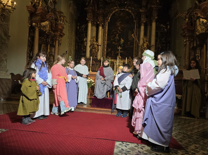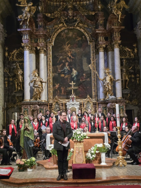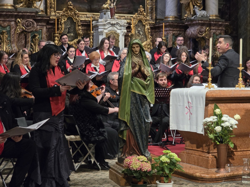 A nap második felében a bécsi piarista templomban került sor szentmisére, ami különös jelentőséggel bírt, hiszen ebben a templomban tanult és szolgált egykor Ruzitska György orgonistasegédként, és Joseph Haydn vezénylete alatt számozott basszust játszott. Húsvét nyolcadát ünnepelve Max Filke Terra tremuit című műve is elhangzott. A szentmise végén pedig a kórus a már védjegyévé vált Horváth Márton Levente Szent Mihály-himnuszát adta elő. A szentmise főcelebránsa a piarista rend osztrák tartományának elöljárója, Labancz Zsolt SchP volt, aki köszöntötte a kolozsvári közösséget és magyar nyelven is prédikált. A zenei szolgálat Ruzitska György kötődése mellett azáltal vált különösen széppé, hogy a Szent Cecília közösség gyermekei ministráltak, az éppen azon a napon ezüstmiséjét ünneplő Labancz Zsolt mellett.