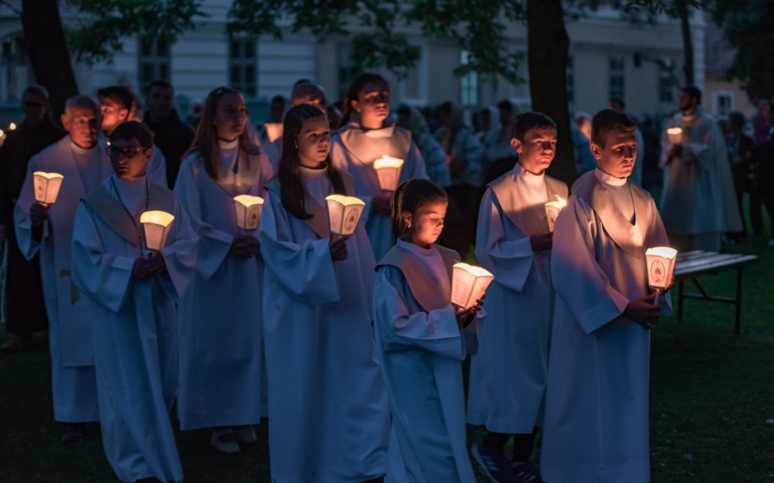 A szentmise után a gyimesközéploki hívek vezetésével az örvendetes rózsafüzért imádkozták a zarándokok, majd a kegytemplom előtti téren gyertyás körmenetben vitték a Szűzanya kegyszobrának másolatát. Az elsőszombati Mária-köszöntőt az erdélyi Mária Rádió és a kegyhely YouTube-csatornája élőben közvetítette.
