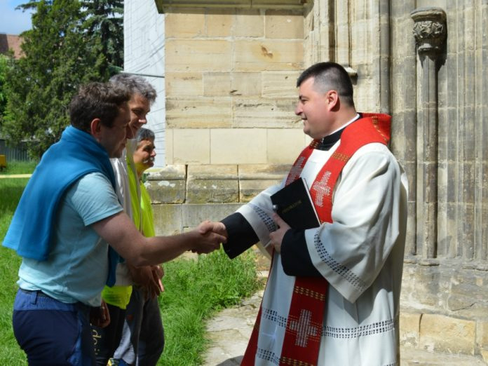 A gyalogos zarándokok kollégáik tapsával kísérve léptek ki a rádió Donát úti épületéből. Kolozsvár főteréig a fotós és újságíró kollégák kísérték őket. Ott, a Szent Mihály-templom déli kapuja előtt Veres Stelian plébánoshelyettes fogadta őket, áldást adott, majd aláírta a zarándokfüzetüket, és azt kívánta nekik, hogy minden feltett szándékukat, céljukat sikerrel tudják megvalósítani, és ezzel az élménnyel lehessenek az ünneplők között június elsején a pápai szentmisén.