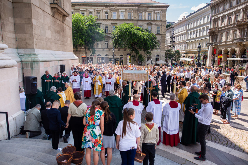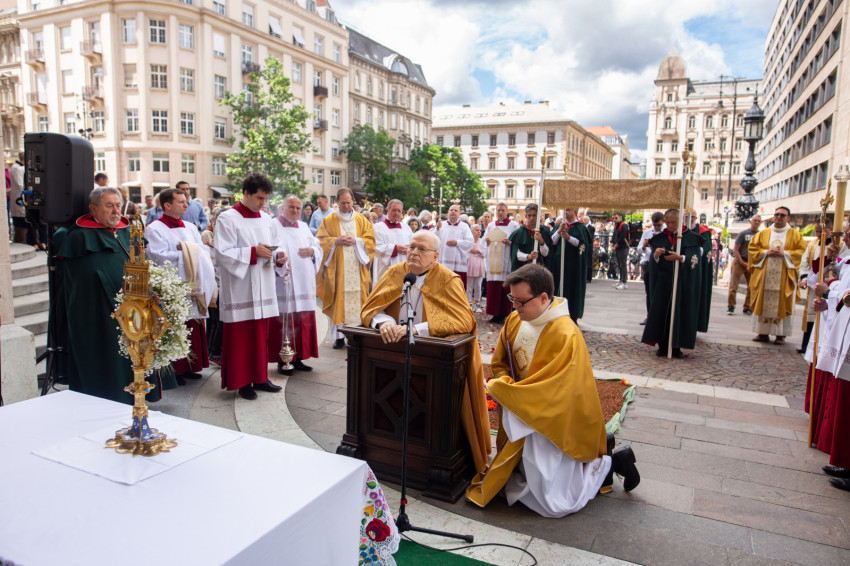 Az úrnapi körmeneten a szentségi Jézussal tanúságot akarunk tenni a világ előtt – emelte ki szentbeszédében a főpásztor. – Isten zarándoknépe vagyunk. Zarándokok, és nem csellengők. Zarándokok, és nem kóborlók. Mert nem céltalanul sodródunk a világban, hanem egyénileg és közösségileg is egy nagy cél felé tartunk. Tudjuk, honnan jöttünk és hová megyünk.