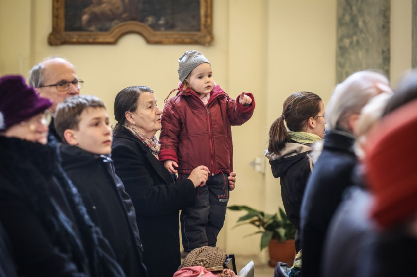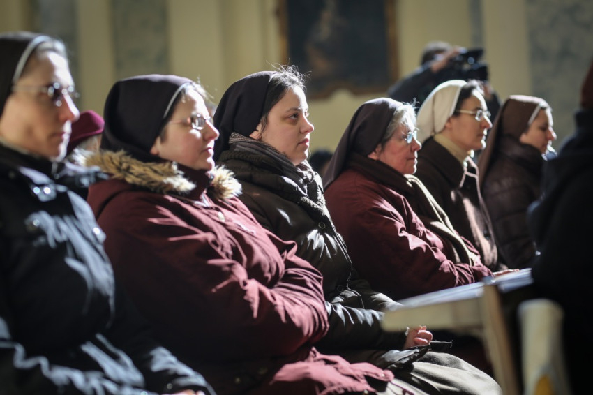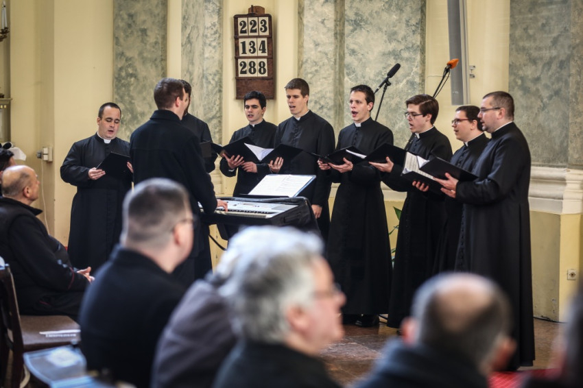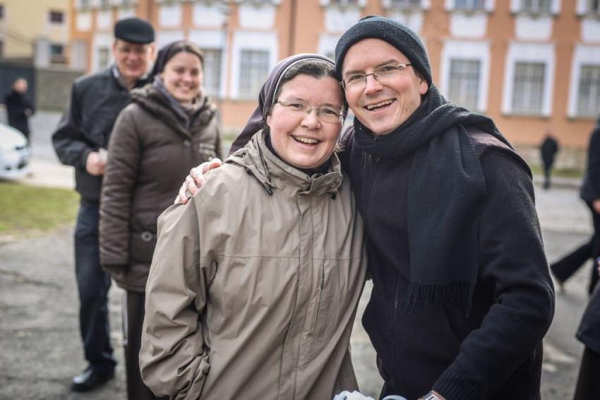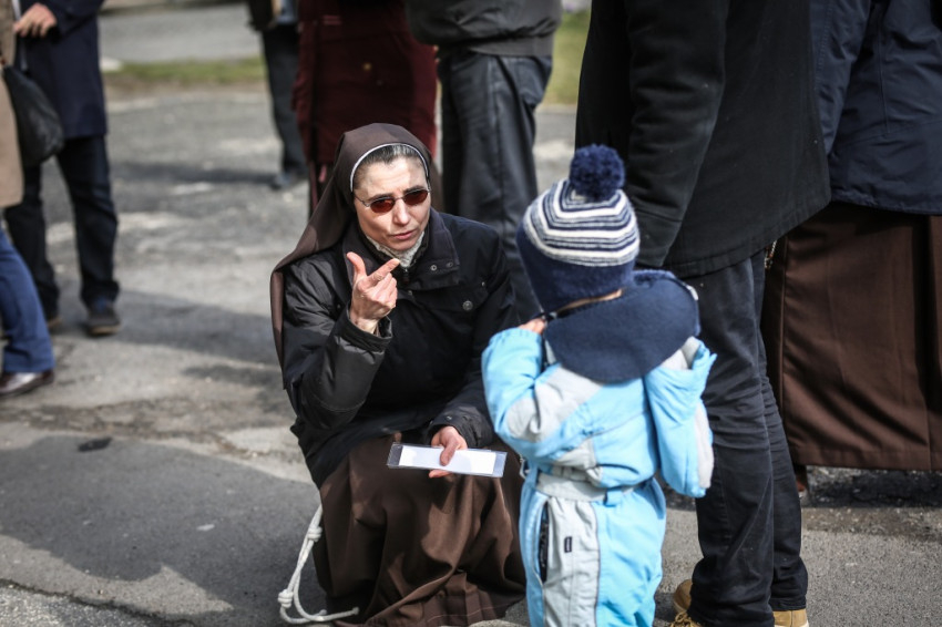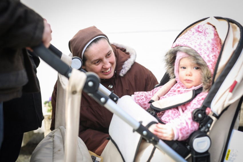 Nem akarjuk elhinni, hogy délután már érkezik a hideg, pedig eleget ijesztgetnek vele mostanában minden csatornán. Verőfényes, tavaszias az idő. Amikor pedig az esztergomi Loyolai Szent Ignác-templom elé kanyarodunk, egyenesen húsvéti a hangulat. Nem sokkal múlt fél tizenegy, amikorra térzenét hirdettek. A templom előtt rengetegen állnak, és körülbelül hat-hét kézben hangszer is van – főleg gitárokat látok, egy nővér kezében pedig trombitát. – Jézus, életem, erő, békém, Erős és szent az Úr – énekli a tömeg, és már éppen kezdünk lelkessé válni, amikor, mintegy öt perccel később a többség bevonul. Talán azért a nagy sietség, hogy a mise énekeinek próbája időben elkezdődhessen. Mi azért, kissé csalódottan még álldogálunk kinn egy darabig, tizenegyig több mint negyedóra van hátra. Kedves jelenetek szemtanúi leszünk. A nővérek afféle fogadóbizottságként ölelgetik az érkezőket, a színen időről időre süteményestálakkal vonul át valaki, sok a kisgyerek, családias a légkör. Érezni, hogy a nővérek mennyire otthon vannak Esztergomban.