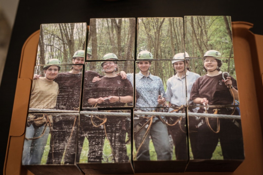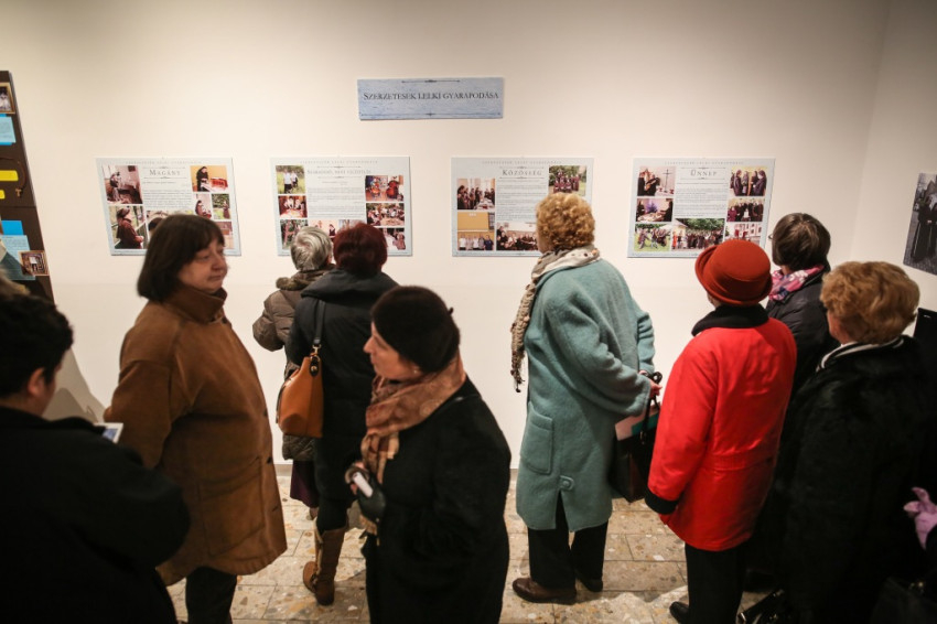 A múzeumban csakugyan óriási a tömeg. Már rögtön a ruhatárral szembeni falon a kiállítás képeit látjuk: a nővérek mindennapjainak jeleneteit, idősek, gyerekek körében, iskolákban végzett szolgálatukat.