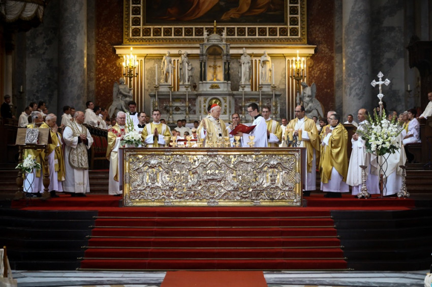Erdő Péter a szertartás kezdetén köszöntötte az ünnepi szentmisén koncelebráló jubiláns papokat és a bazilikát megtöltő híveket.