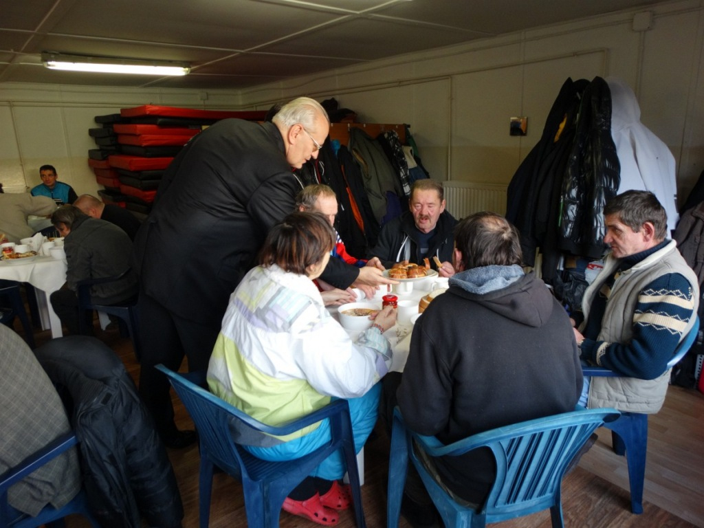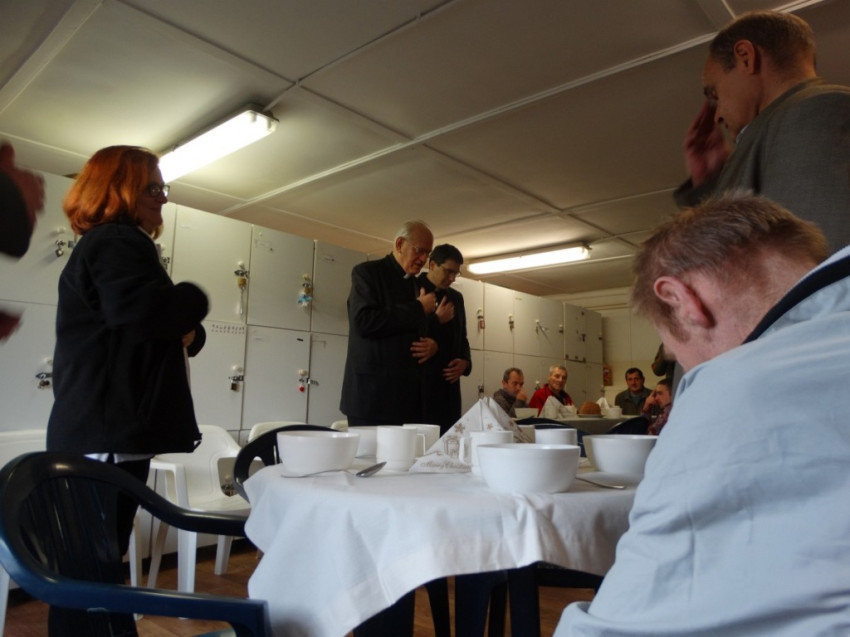 Az ebéd elején Erdő Péter bíboros mondott asztali áldást a nappali melegedőben. Röviden köszöntötte az ünneplőket, és azt hangsúlyozta, Jézus a legnagyobb ajándék számunkra, aki maga is hajléktalan csecsemőként érkezett a világba, majd volt ártatlanul üldözött és elítélt ember, akinek még annyi sem járt, hogy utolsó óráit a siralomházban töltse. „Ő volt azonban az, aki kimondta az utolsó szót azzal, hogy feltámadt. És minket is az örök boldogságra vár. Ezt köszönjük neki, ezért ünnep számunkra a karácsony. Ünnepeljünk hát, és adjunk hálát a kis Jézusnak, és egymás felé is adjuk át azt a szeretetet, amit tőle kaptunk.” – mondta az asztali áldás előtt a bíboros. A főpásztort a szeminaristák hívták meg az ebédre, ahol a bíboros a sütemények felszolgálásában is segítséget nyújtott a melegedő munkatársainak.
