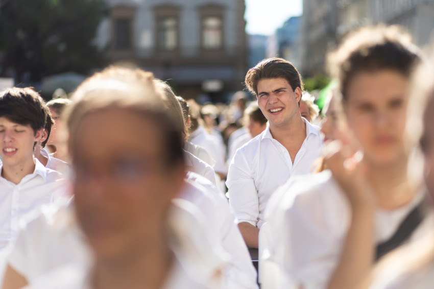 Ünnepélyesen a bazilika lépcsőjére vonultak az intézmények zászlóival az erre felkért diákok. Harangzúgás töltötte be a teret, amire a több ezer résztvevő elcsendesedett. „Veni, Sancte Spiritus” – szólt az ének a bevonulás alatt.
