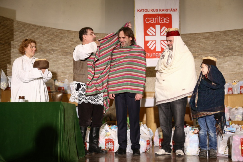 Ahogyan a korábbi években is előadással kedveskedtek a jelenlévőknek, idén a karitász igazgatójának köszöntője után a pécsi MárkusZínház népi betlehemes báb-előadása következett. Az ebben a hónapban nemcsak Magyarország több városában, hanem Franciaországban is bemutatott Betlehemi történet mind a gyerekeket, mind a felnőtteket bevonva hozta közelebb karácsony misztériumát a jelenlévőkhöz. Az előadás különlegessége az volt, hogy a pásztorok Betlehemet kereső útján a gyerekeknek kellett segíteniük megtalálni a helyes utat, illetve a három királyok szereplői is a sorok közül kerültek ki.